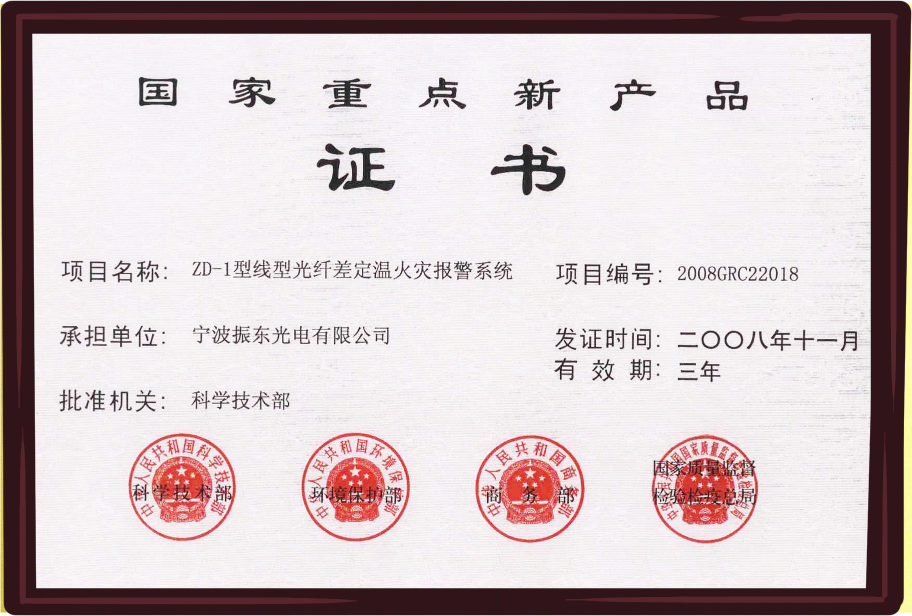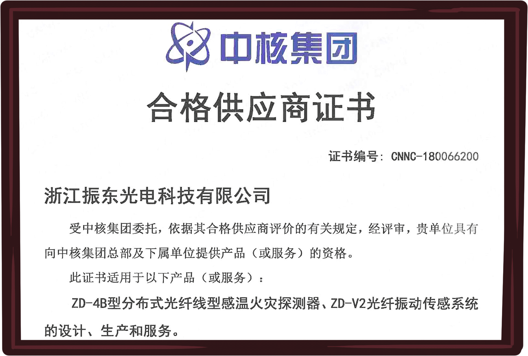 公司“振東”品牌“ZD系列”光纖傳感系統(tǒng)產(chǎn)品已通過國(guó)家消防電子產(chǎn)品質(zhì)量監(jiān)督檢測(cè)中心和 國(guó)家安全防范報(bào)警系統(tǒng)產(chǎn)品質(zhì)量監(jiān)督檢驗(yàn)中心檢驗(yàn),并已獲得應(yīng)急管理部消防產(chǎn)品合格評(píng)定中心CCCF認(rèn)證證書。同時(shí),產(chǎn)品已納入中核集團(tuán)合格供應(yīng)商體系、中廣核商務(wù)平臺(tái)和海灣安全技術(shù)有限公司合格供應(yīng)商體系。